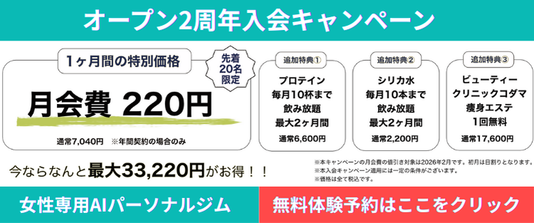 RISA2025-10-24 女性専用なので、安心して通いやすいです! 自分のペースでトレーニングできます。 施設内もいつも綺麗で、気持ちよく利用させていただいています。 スタッフさんもとても親切です! mi yo2025-10-12 決まった曜日にジムに行く必要がなく、行きたい時に体を動かしたい分だけ運動できるのでとても楽しく運動できています! 有酸素運動もできて楽しいです! k y2025-10-12 他のジムは自分で重量調整をしないといけませんが、ここは自動で自分に合わせて調整してくれるので、何も考えずにでき、便利だと思います。 野元ありす2025-09-16 気軽に通えて鍛えれます 猪野華菜2025-09-09 15分で終わるので苦じゃない!楽しい! T A2025-09-09 最短15分でトレーニングが完了してスキマ時間で完結できるので無理なく通えてます(*^^*)スタッフの方も丁寧で優しく女性だから食生活やアドバイスもくださり話しやすいのも魅力的です( *´꒳`*)ダイエットをしながら身体を鍛えられて一石二鳥なのでたくさんの方に魅力を知っていただきたいです!これからも通い続けます(*´˘`*)♡ 川﨑麻未2025-07-04 自分のペースで運動できるので、通いやすいです! スタッフの方も優しいです! くま2025-06-19 施設が綺麗でA Iで管理されているので自分で重さ調整などをせずにスムーズに始められます。ジムの雰囲気もいいので通いやすいです。
